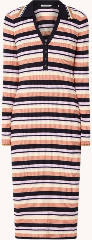 Onze nieuwste midi-jurk heeft lange mouwen en een gestreept motief. Deze getailleerde en ribgebreide jurk met V-hals heeft een klassieke polokraag met vier knopen.